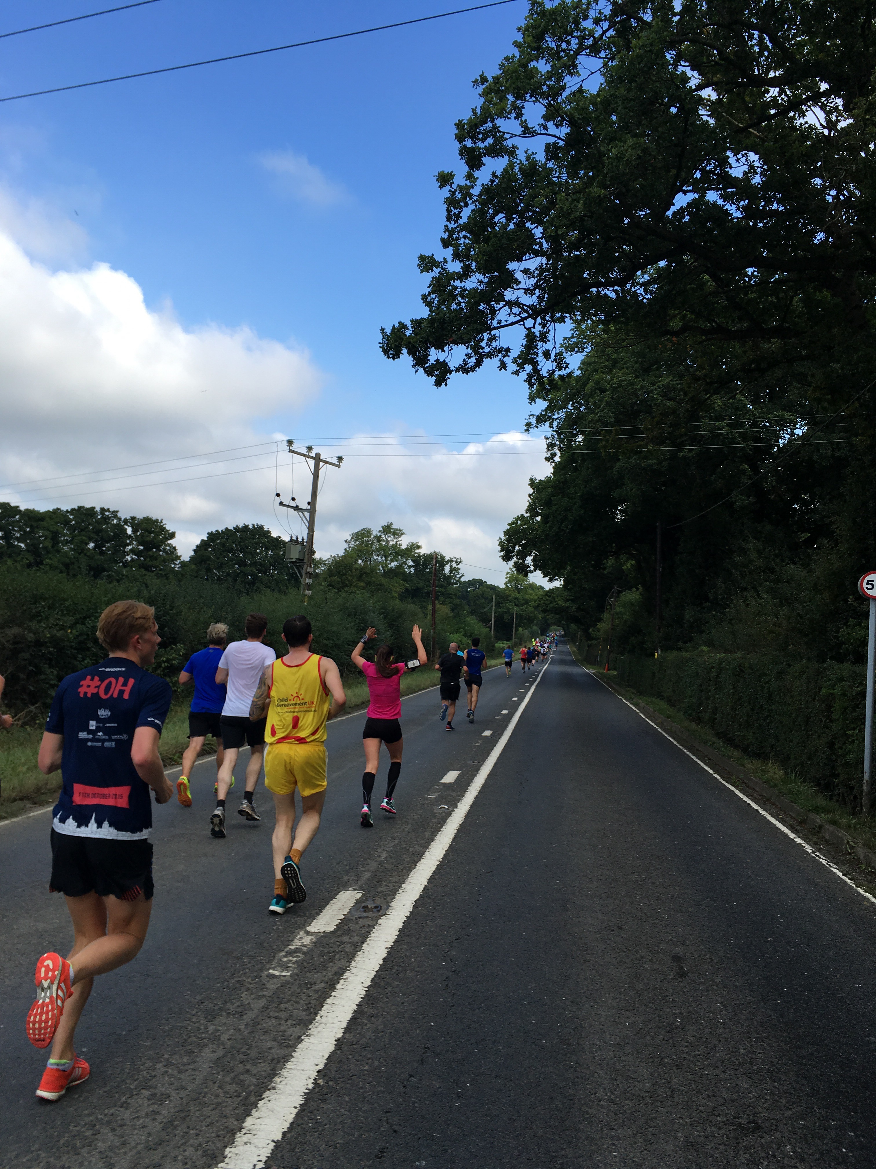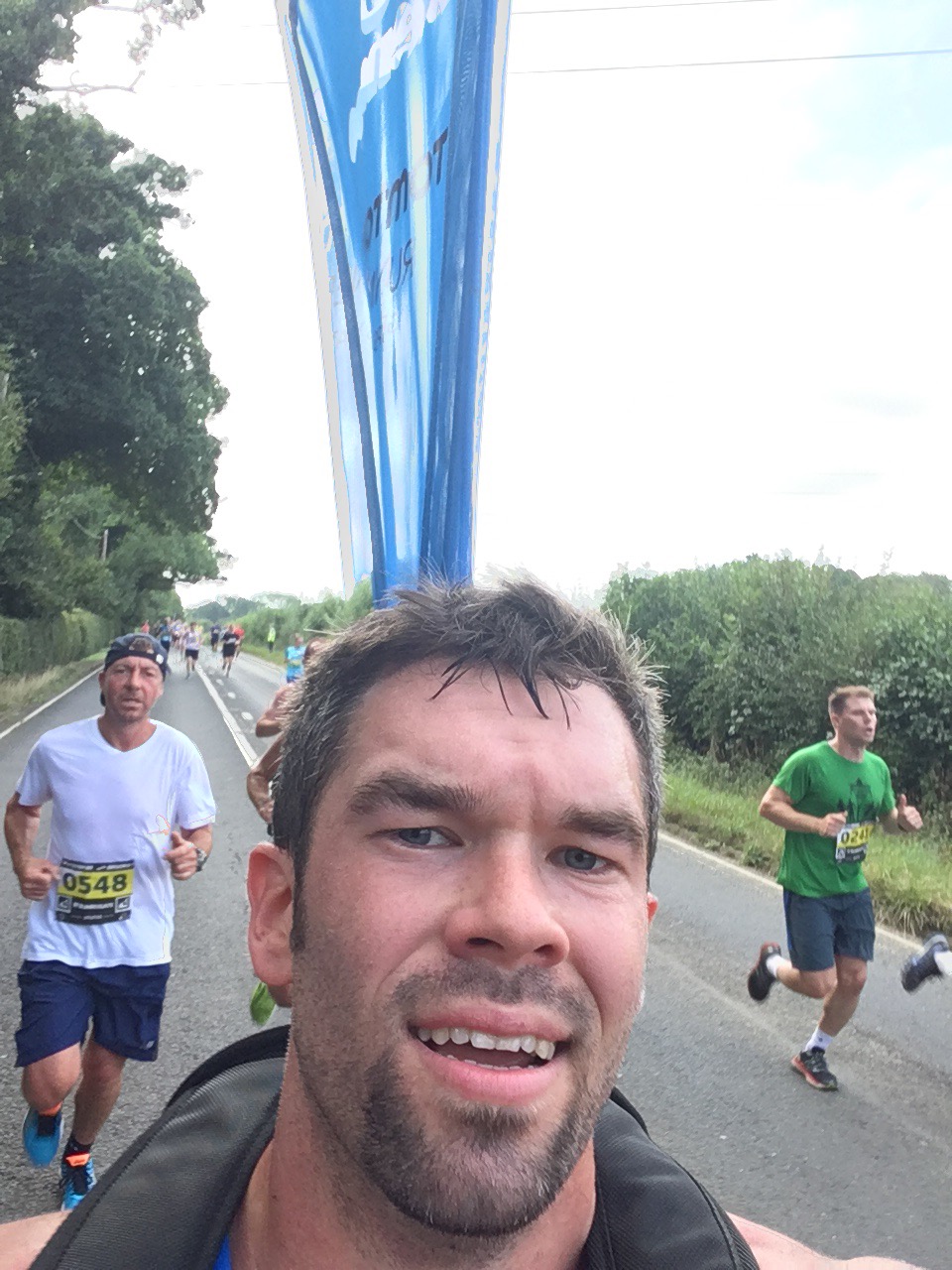 With an engaged group, full of people confident for a 1:40, we were off. I remembered this was a challenging course, but forgot how hard it started. As we left the park we immediately hit the first big hill, I was not sure if it was like this the whole course, so did not want to lose time this early. So, I powered us up the hill on pace. The downhill was fantastic, and it was impossible to keep everyone back, but I thought this was a great opportunity to give us the cushion for the end. I did not expect to do this, but because of the first downhill, and powering up it, we ended the first lap in 7:07, we had our 30 second cushion and we had done one of the hardest hills. I called out to everyone around and they were still there. I naturally took the front of the group and Pete eased back a little so we had a group between us. The next few miles were undulating to say the least, but it was a pleasant route, taking in some nice surroundings. There were plenty of people out on course to give us motivation, and there were water stations every 3 miles. The support of the locals was evident with so many holding bowls full of jelly babies for us.