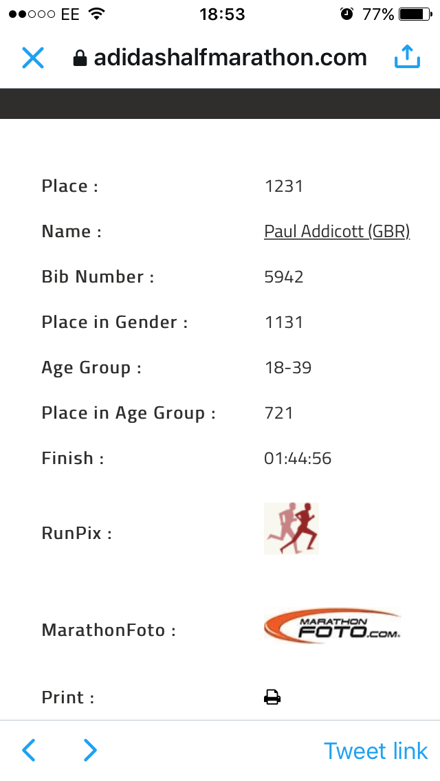 Pacing this race is fairly difficult though because the mile markers are always massively out. I completed the first mile in exactly 8:00 flat, which is perfect. But did not meet the marker for another 10 seconds. By mile 3 we were about 400 metres out, and this remained all the way to mile 12. I was very vocal about this to the runners around me, and my splits all sped up between 10-20 seconds a lap to get me to where I needed to be. The key about doing this as a pacer is to do it gradually and keep everyone informed. By the time we got to mile 12 I was 2 minutes ahead of the pace according to mine and everyone else’s watch, but I was within 10 seconds of the mile marker. I made everyone aware that worst case scenario we would tuck in 10 seconds under, best case for them we would be 2 minutes quicker. I did expect the course to even out in the last mile, but I can’t rely on that just in case, and would rather be quick than slow so everyone achieves. The 13 mile marker was then right next to the finish. I saw this a while out, as you can see far ahead on this circuit course. I therefore slowed to encourage everyone around me. I wanted them all to know that I was the marker and as long as they were in front of me they would get under 1:45. I then came through in an official time of 1:44:56 which I am really happy with.