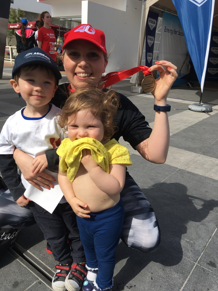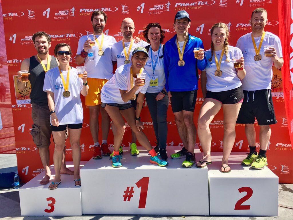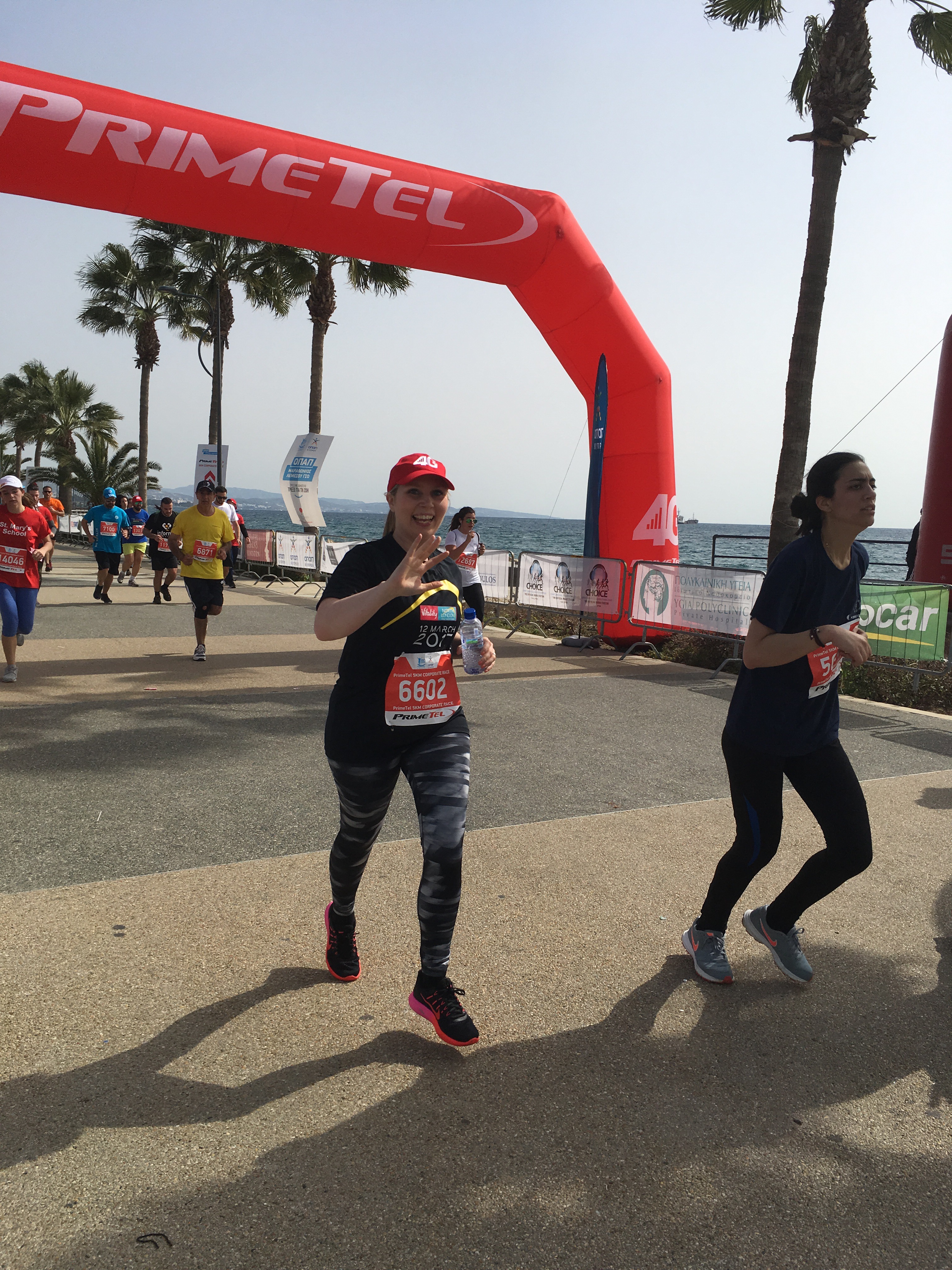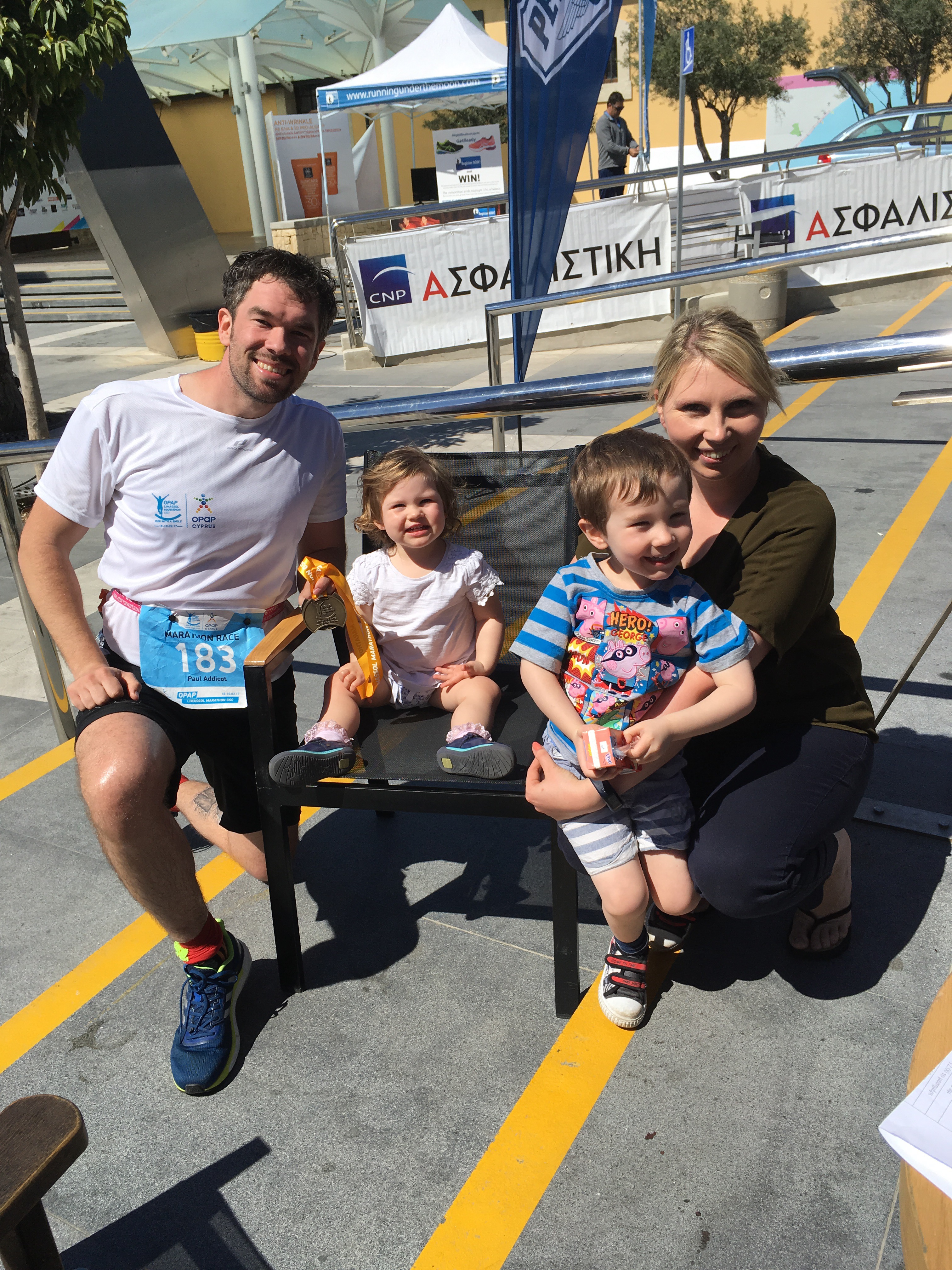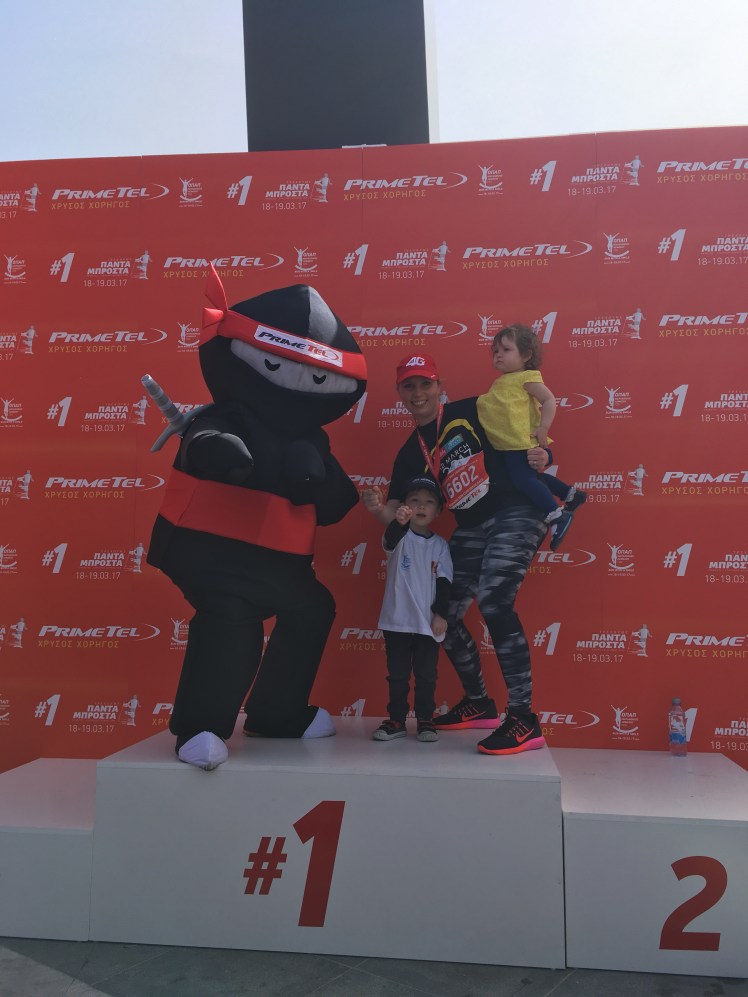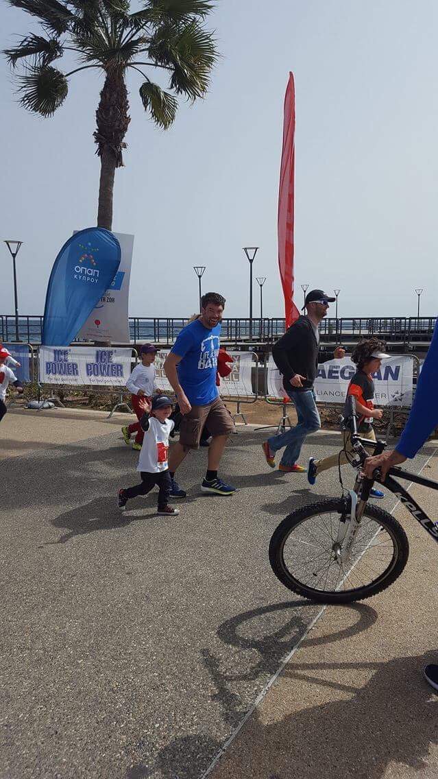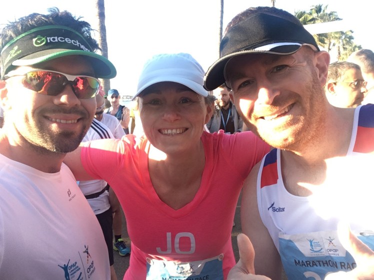 “I’m used to our holidays centering around Paul’s sporting events so it was refreshing to get the chance to participate too! And this was made possible because of the hospitable organisers of the limassol run series asking a participating company if they minded me using one of their spare places, so to them I am grateful!! The journey to the run was a bit chaotic with two kids and a slower than usual bus service, then factor in that half the journey to the start was closed for the run, we ended up speed walking to the start line! But it was a relaxed event, everyone was chatting and the sun was shining, it felt unlike any races I’ve done in the UK. As we passed through the barriers to the start we were offered a free hat, provided by one of the sponsors. A nice touch given that the sun was pretty low still and slightly blinding! After a lot of chatter in a language I didn’t understand, the wheelchair participants got going, followed by the masses ten minutes or so later. Again, the start of the race was a little different to what I’m used to… being a fun run, many of the participants decided to walk the event but started right at the front of the pack… some were carrying lattes, others their handbags. As a result it took a good five mins to actually get to a running speed! Nevertheless the atmosphere was fab, and the route clearly marked. At points the course was marked with cones and I saw a fair few people trip on these; but that’s my only gripe. Despite the slow start and the heat, I actually ran quicker than my current park run pace which I was pleased with. A basic but nice medal and as many bottles of water as I could carry were waiting at the finish line, a thoroughly enjoyable and well organised event”.
