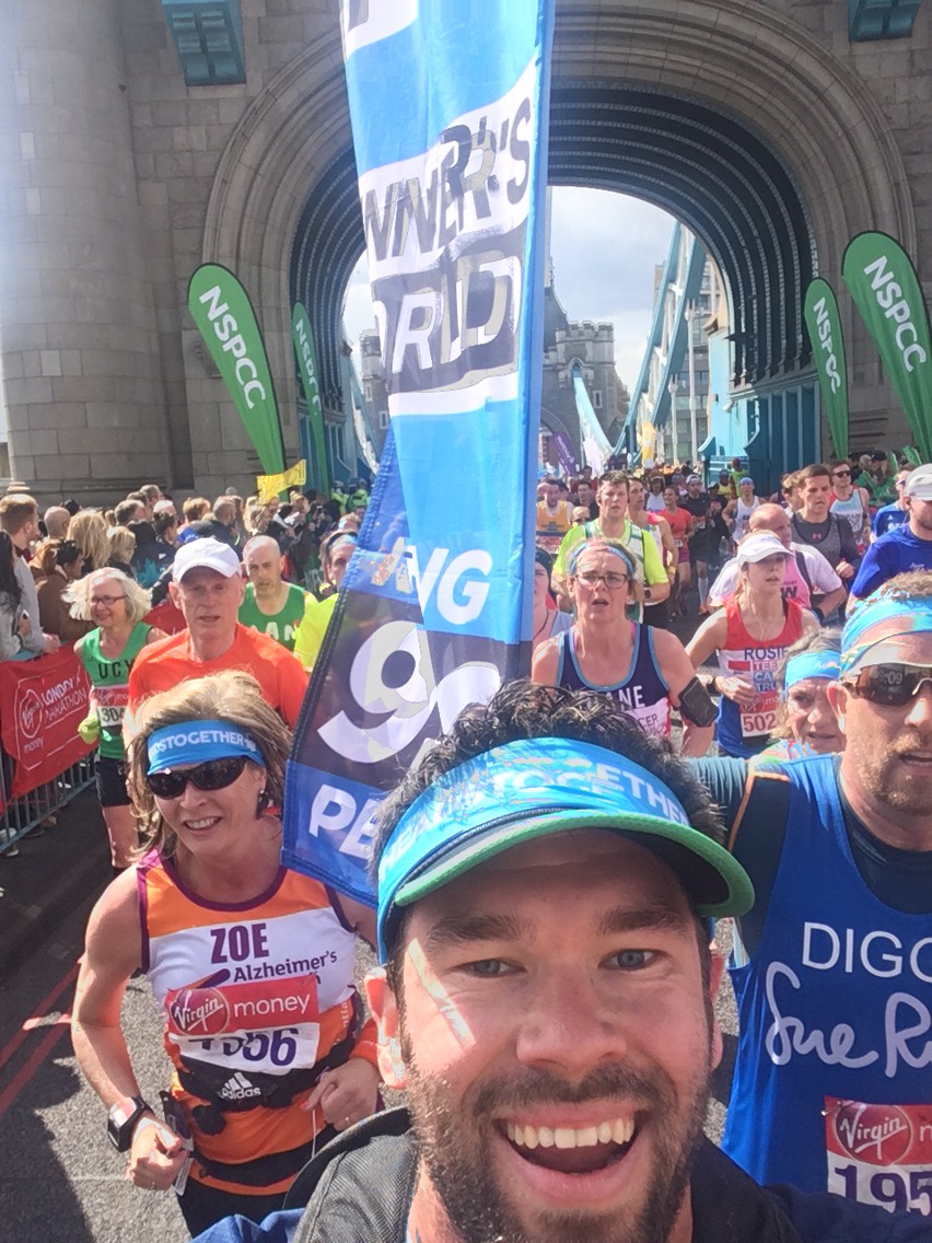 When you get to Tower Bridge you know you are almost half way there. You turn the corner and are hit by the noise. This is a fantastic part of the course, and the beauty of the city is really made special by all those on the Bridge, both watching and running. At this point it was great that I had most of the people that started with me still with me. I’m not entirely sure how many as some stayed close and others ran around me, all I know is there was a large happy funbus.