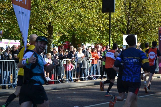 As always some stayed with me, some went on ahead at various points and dropped back. Others I picked up along the way. With so many people filling the streets of London there is always a great atmosphere. Having run this event numerous times you would think I know this route off by heart. Well this year I did. I spent the last year working by St James Park, with my lunch time run consisting of a lap of the serpentine. It was great knowing the route this well, and being able to know what was coming next. I provided a tour service as we went along…. “when we turn to the right we will have Buckingham Palace on our right and on our left will be the Mall, where the London Marathon finishes”.