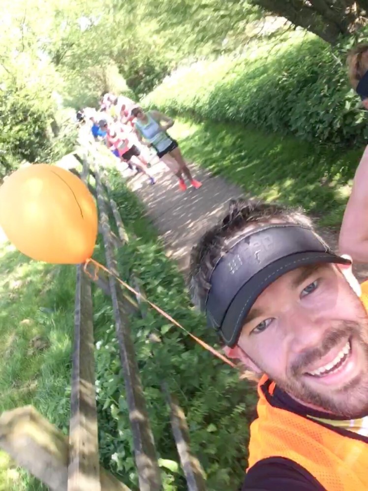 At 7 miles the full carry on straight and the half turns off right. It becomes much more intimate with a more spread out field. The paths become narrow, but across lovely fields and alongside a river. It’s like a different race, both good in different ways. The heat really took its toll on people and around mile 9 people had started to fall away. I tried to shout out encouragement but it really was hot. I kept a steady pace, but had to go faster as each mile marker was further away, so to just achieve my time I had to run between 7:50 and 7:55. Although it was hard everyone did such a great job keeping up the pace in the heat that reached 26 degrees.