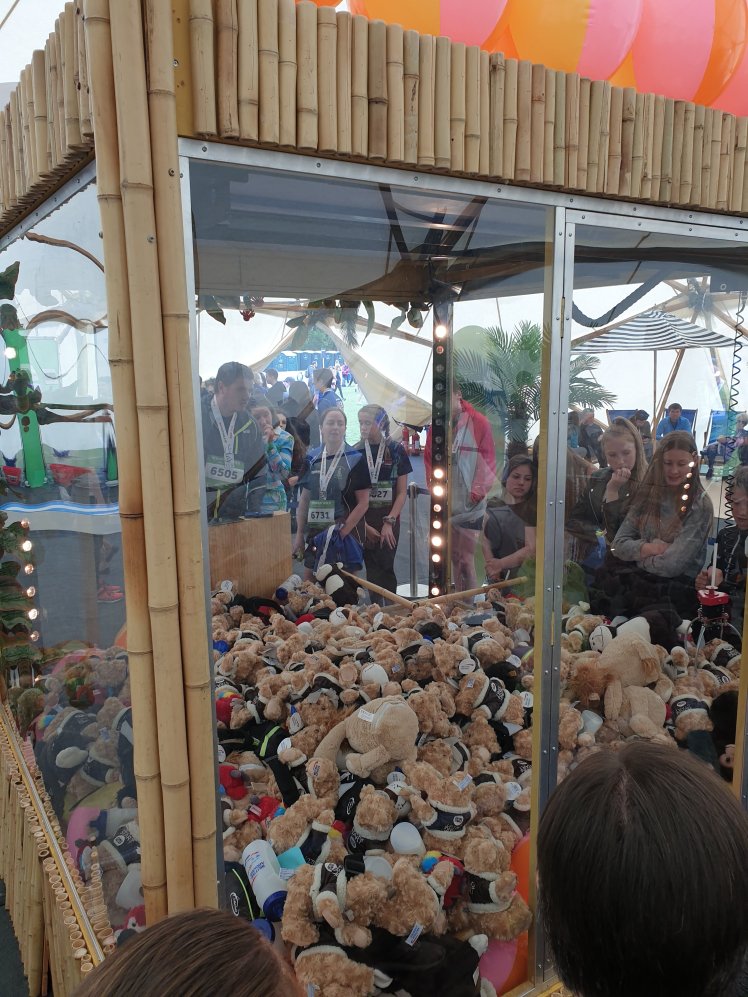 After the run I got my tee and medal and made my way straight to Base Camp. I joined an hour long queue to have a go at the teddy grabber. The queue took far too long in my view, but the intent behind it was great. Three teddies had stars on for free flights. Last year it was a random generator which was quicker and I think there were more flights on offer. This year it is still fantastic prizes, with the bonus of winning teddies, however this may have backfired with some of the stars potentially unreachable, so unless they went in an mixed it around towards the end, these may not have been won at all. I may not have won a holiday, but I did win a teddy for my kids.