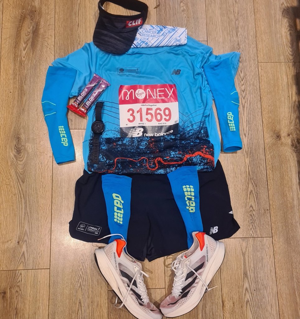 As always I got my kit ready the night before. I have been looking out for a racing shoe and wanted something with carbon to see what the fuss was about. I’ve now got 4 pairs to choose from (Adidas, Hoka, On, xstep) but I haven’t managed to put many miles into any of them in training. The Adidas Adizero Pro 2 have been broken in and so were the obvious choice for me. They are not much of a training shoe, but on the course they felt great. I’ve got one blister on a toe, but other than that my feet are in tact and the worries I had about stability were absolutely fine even with the twists and turns at London.