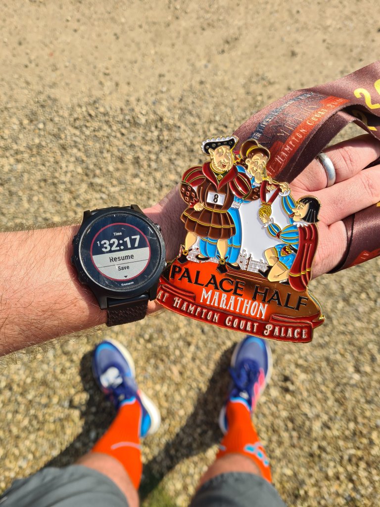 The process of signing up on the day was easy, so I signed up and dropped my bag, making my way to the start line in front of the Palace. A couple of weeks ago, I finished Surrey Half Marathon in 1:29. This course is flatter, so I had hoped to finish as fast, or slightly faster, ideally. I am marathon training, so I do not want to push too hard for the half, but that doesn’t stop me wanting to improve. The start went well, and I held a good pace for the first mile, but I started to feel heavy and slow after the first mile. Honestly, all the beer and food I’ve been having lately probably doesn’t help, but that aside, the reason for wanting to enter today is I know my training has been poor. There is no way to sugarcoat it; you get out what you put in, and I need to put more in. It’s hard pushing when you know you have done better, but that’s the only way to improve, and we all have ups and downs.
