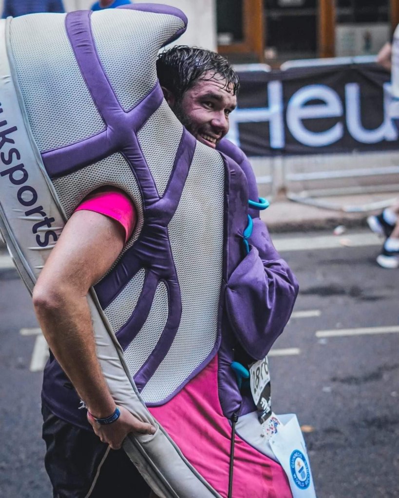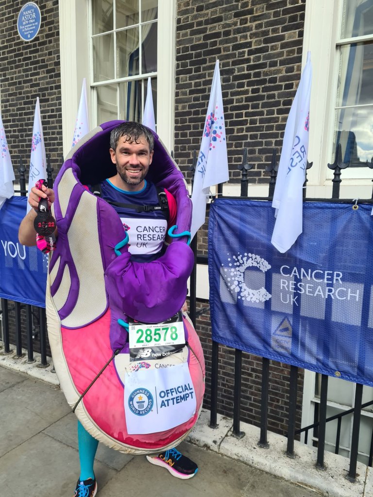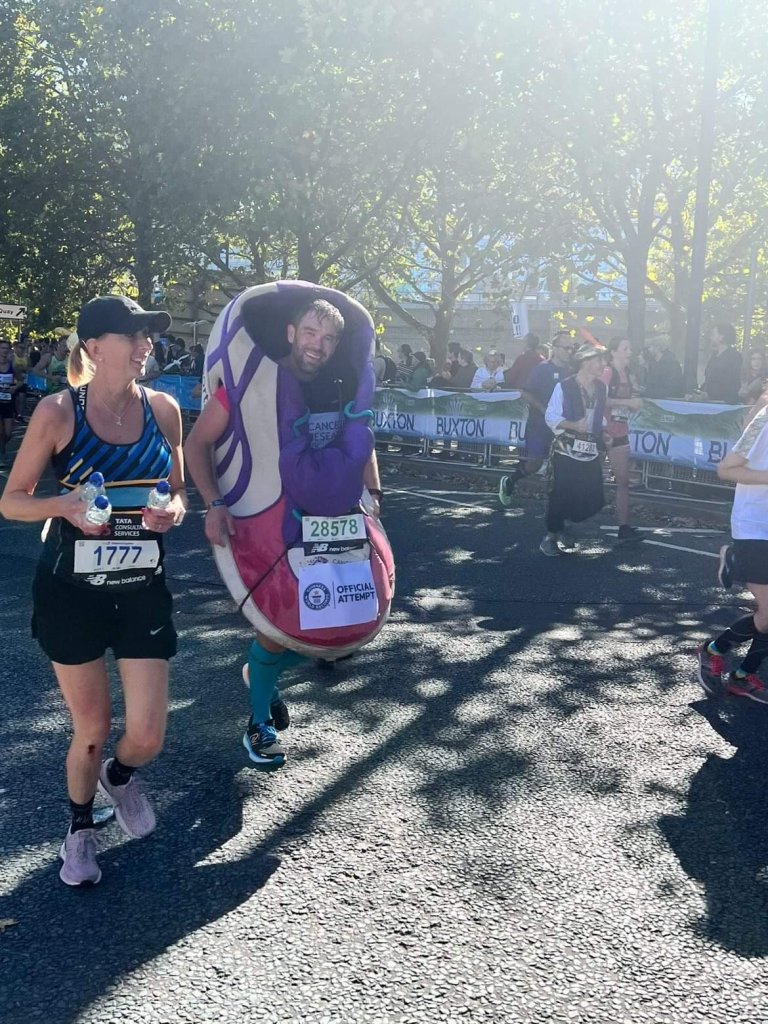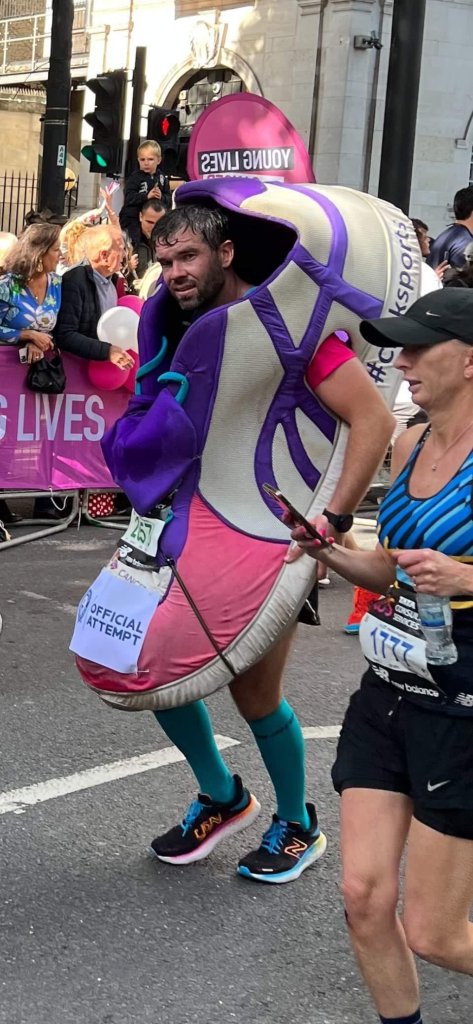 I already had a place running with Cancer Research again. I haven’t hit my fundraising target, so I wanted to do something different. So I asked for costume ideas, and I spoke with Cancer Research who advised they had the shoe costume. So this is where the madness started.