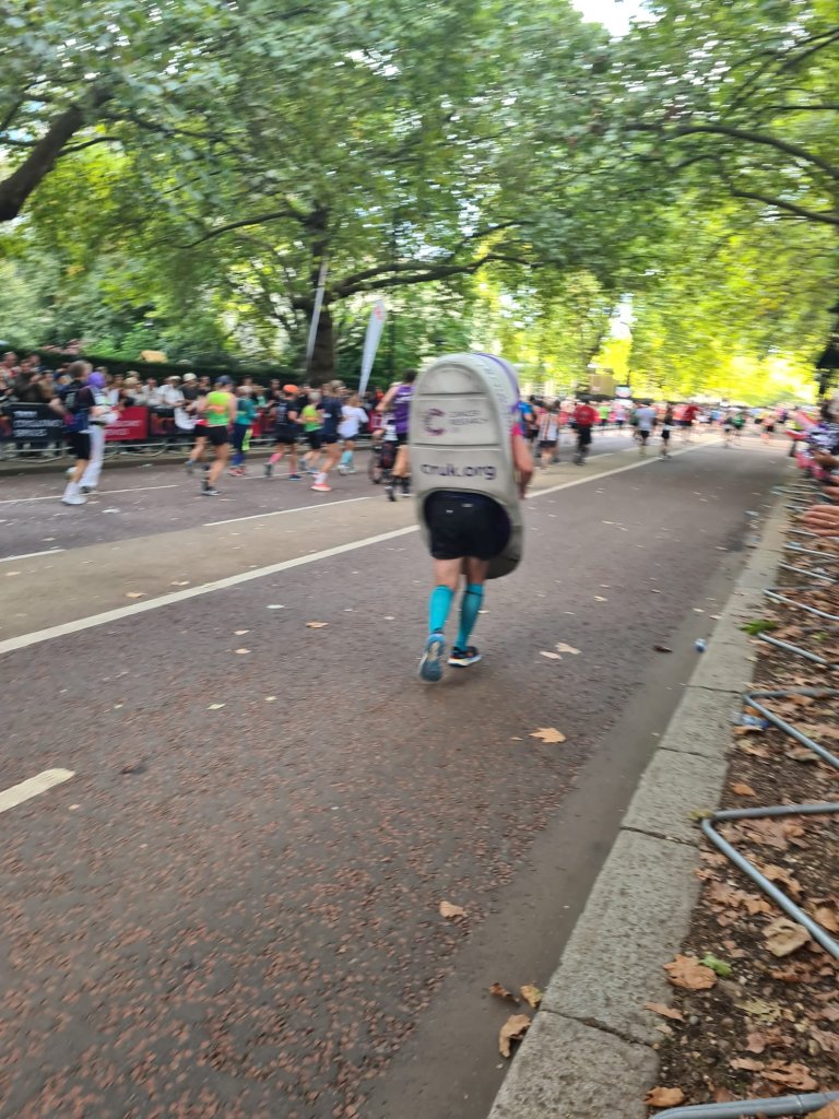 So instead I tried to engage with the crowds, but I must have looked a hot sweaty mess. The screams of “shoe” will never leave me, the dad jokes about shoes people said as they passed me, the support all the way was just incredible. I saw so many friendly faces as I was running, and I am very grateful for the support. I ran my first marathon as a Rhino in 2011, so on my 10th London Marathon it was great to run in a costume again. Today was not my day, I was just too hot and my legs couldn’t pick up the pace, but the reality is I didn’t enter for the record. Yes, it would be nice and it would help raise more awareness for Cancer Research, but I hope I did that anyway just be finishing in the Cancer Research shoe.