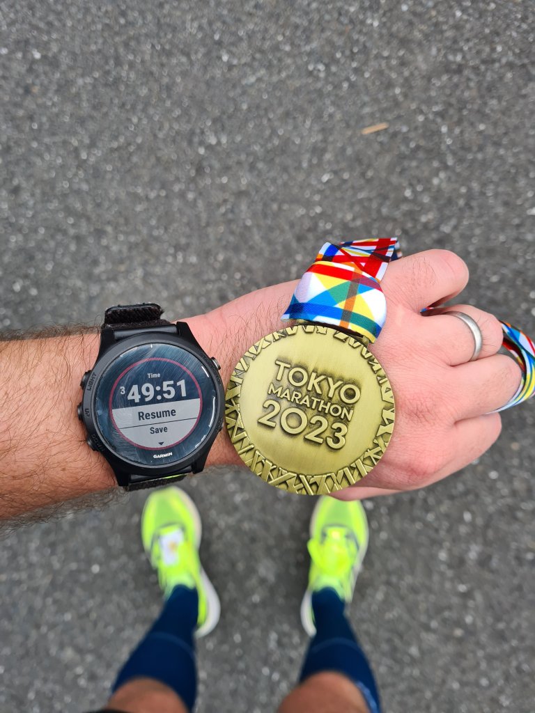 I saw lots of people on my run, so many people I knew and so many people collecting their 6th star. I didn’t let myself get too carried away, but I did get tired, and I eased off getting to half way on pace for a sub 3:20. After thus is just gradually started slowing and didn’t really feel like pushing any harder. I haven’t slept since I’ve been in Tokyo and I wanted to get to the end in a state that would allow me to enjoy the evening, so instead I let myself ease back, took it all in, and came in with a finish time of 3:49:51.