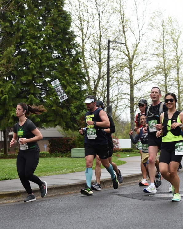 I was pacing the 4:05 group. As times were based on Boston Qualifier times, there were no 4 hour pacers. I was tempted by 3:55, but I wanted to be sensible, having run so many marathons in April, so I opted for the slower time. Eugene Marathon was my 133rd Marathon, and the 39th time I have paced a marathon.