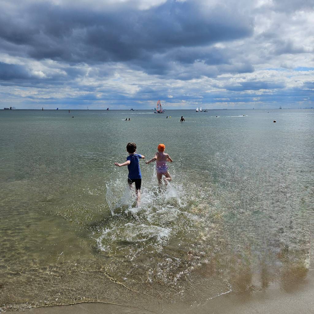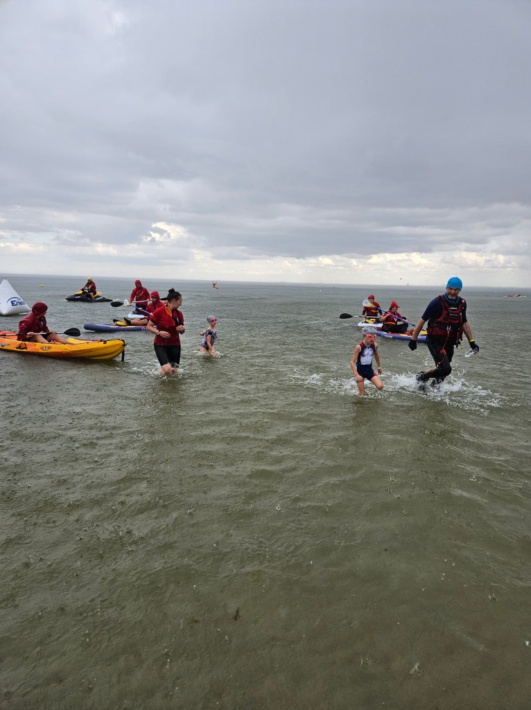 But he was so brave and did a great job. The swim was 200 metres and went too deep for him, so I swam out to support him so he could complete the swim.