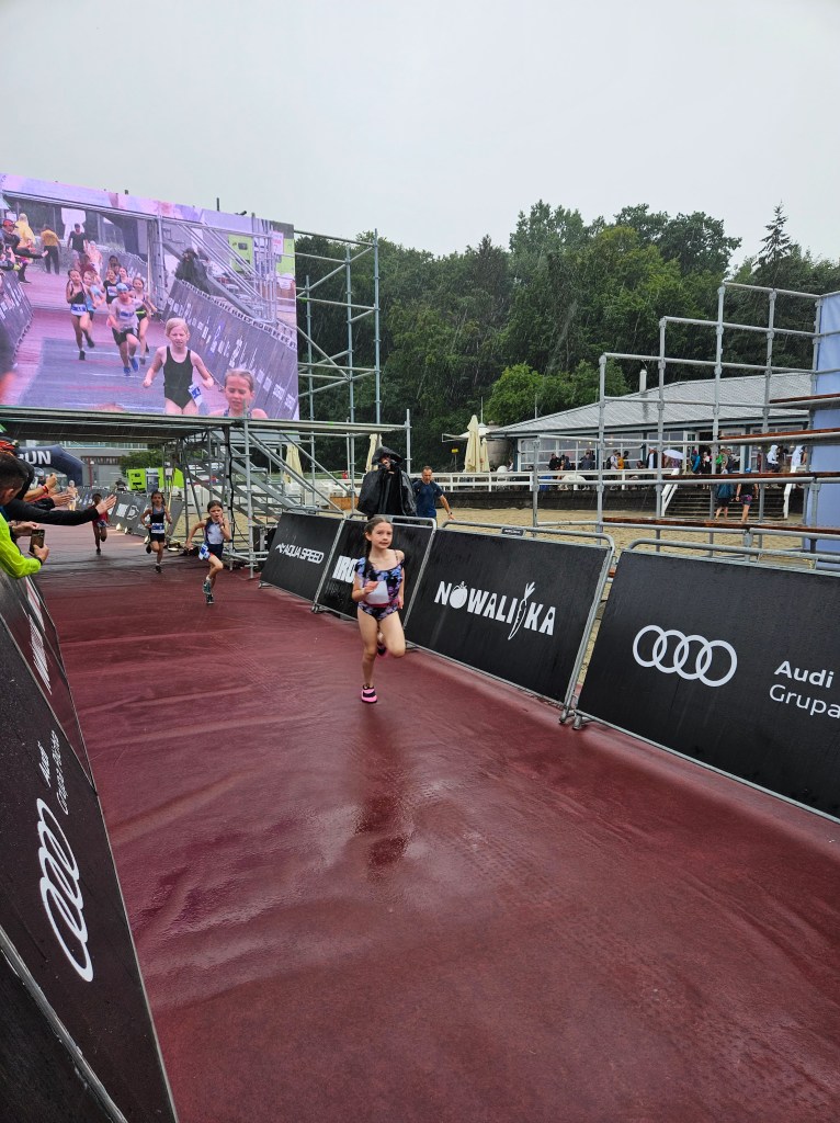 Amelie did her race first. Unfortunately, she was in an older age group as she had her birthday 3 days earlier, and she had to do double the distance. Clearly, lots of people did not put their real date of birth as there were many older kids in the first group, and Amelie was definitely the smallest in her wave. As she started, a thunderstorm started, and it absolutely tipped it down.