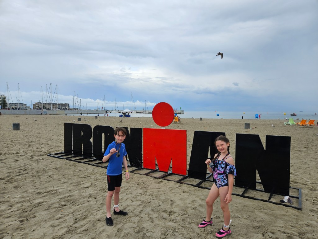 On Friday, we collected all our gear, bibs for the Ironman, Kids Aquathlon, and Night Run. I got my usual t-shirt and visor, and the kids each got a top and Teddy. I also collected my bike, which I hired. We then went to the beach so the kids could practice their swimming.