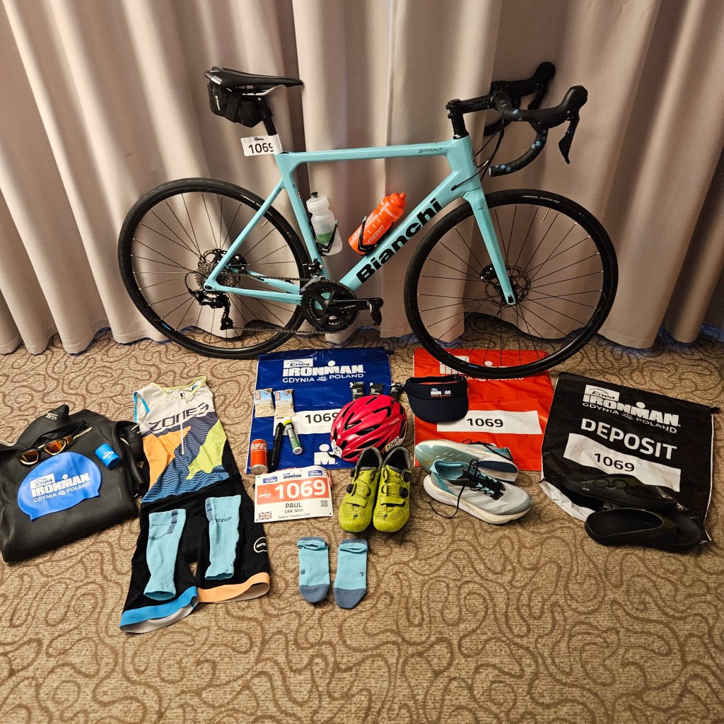 I hired my bike, like I usually do when I travel. It gives me peace of mind of nothing getting broken, which could end up very expensive and lead to a DNS. It is expensive but not as expensive as getting bike to and from events. The logistics of taking it apart, getting it to the airport, on plane, then to hotel, then building again (which I don’t know how to do). All things considered, much better option to pick it up at the expo, and then with many (such as Ironman Gdynia) you leave it in transition and they collect it after the event, so one less thing to worry about. When I knew I was getting a Bianchi, I had a good idea what colour it would be, so I matched my socks, calf guards, and trainers.