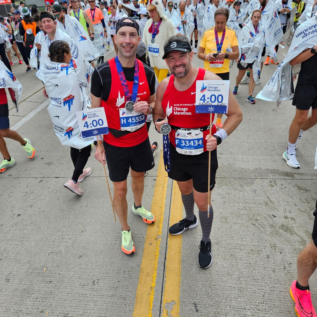 It was a strong finish, and there were lots of happy faces at the end. I finished in an official time of 3:59:40, which I am very happy with. But what makes it most special is hearing about all the PB and sub 4 finishers that ran with us. Well done to all of you. You were amazing. And for those that didn’t quite make it, don’t worry, there will be other days. Also, well done to Kiptum with a new world record, achieving a second half negative split, a sub 2 marathon is close.