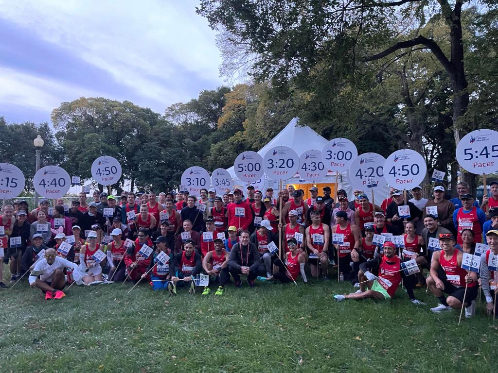 It was nice having somewhere to rest before the start and having access to a toilet, which I know can get busy. I was in wave 2, which sets off at 08:00. We made our way to the start at around 07:20, just before wave 1 started. There, we found our spot and spoke with runners around us. I was pacing with Eric and Stephen, and we worked well in the morning briefing and supporting everyone looking to run with us. I enjoy this part of the day, and gave my usual style of talk at the beginning, aiming to both provide advice and give confidence to runners, whilst having a laugh and easing everyone’s nerves through the spirt of running for fun. We had a big group of people with us, lots of people running Chicago for the first time, aiming for a sub 4 for the first time and a number of first-time marathoners.