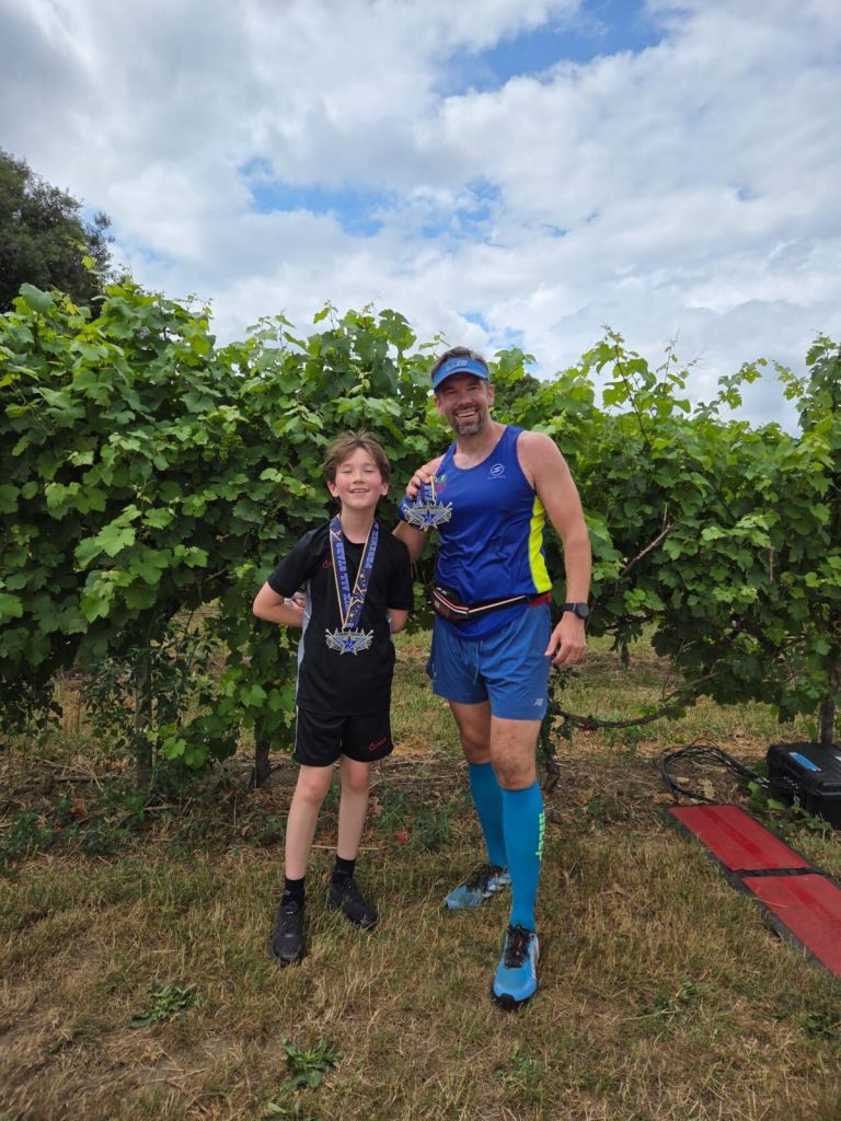 He started running for the finish far too soon, but I had to pick up the pace otherwise I would have no chance to catch him. It became apparent quickly that he wasn’t going to slow down, so after a chilled marathon I had a sprint finish with my boy. He led the whole way, at one point a good 10 metres ahead of me, but I just managed to catch him ok the finish for a tie, as we both collapsed at the finish line.