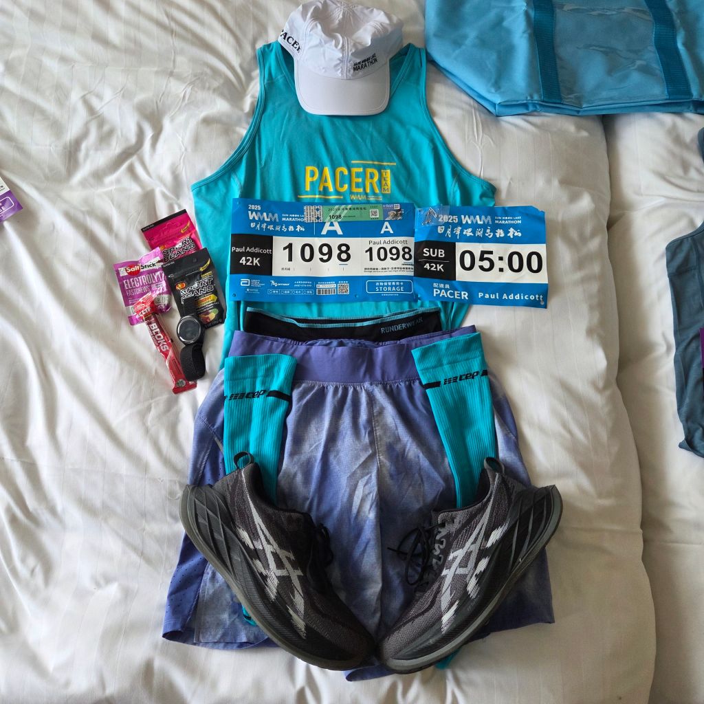 I got my kit ready the night before, with some lovely items as part of my #flatlay. First of all it was a pretty cool pacer vest, but also the hat has pacer embroidered into the side, which was great touch. I also got a participants vest which is really nice, and the bag drop bag is a really large bag which will be great for travel.